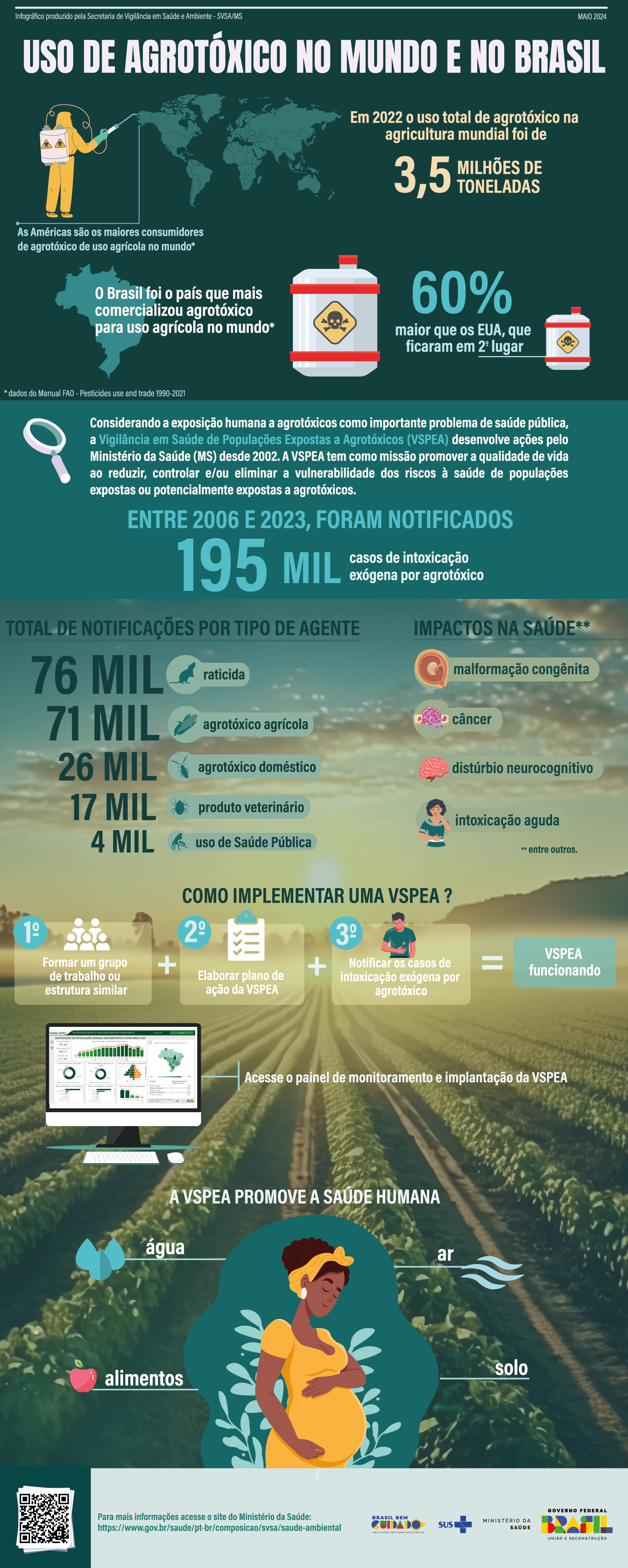 Explore infográficos oficiais sobre análise de dados em Saúde Pública, que apresentam informações atualizadas sobre o uso de agrotóxicos, a exposição ao chumbo e seus impactos na saúde da população. Os materiais utilizam dados epidemiológicos para apoiar a Vigilância em Saúde, o planejamento de ações e a tomada de decisão baseada em evidências. Acesse os links e amplie sua compreensão sobre o tema.